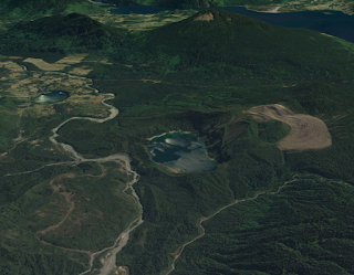 | Grupo volcánico Carrán-Los Venados. Volcanes Pocura a la izquierda, Riñinahue a bajo a la izquierda, Carrán al centro, y Mirador a la derecha de Carrán. Foto: Propia. (Google Earth) |